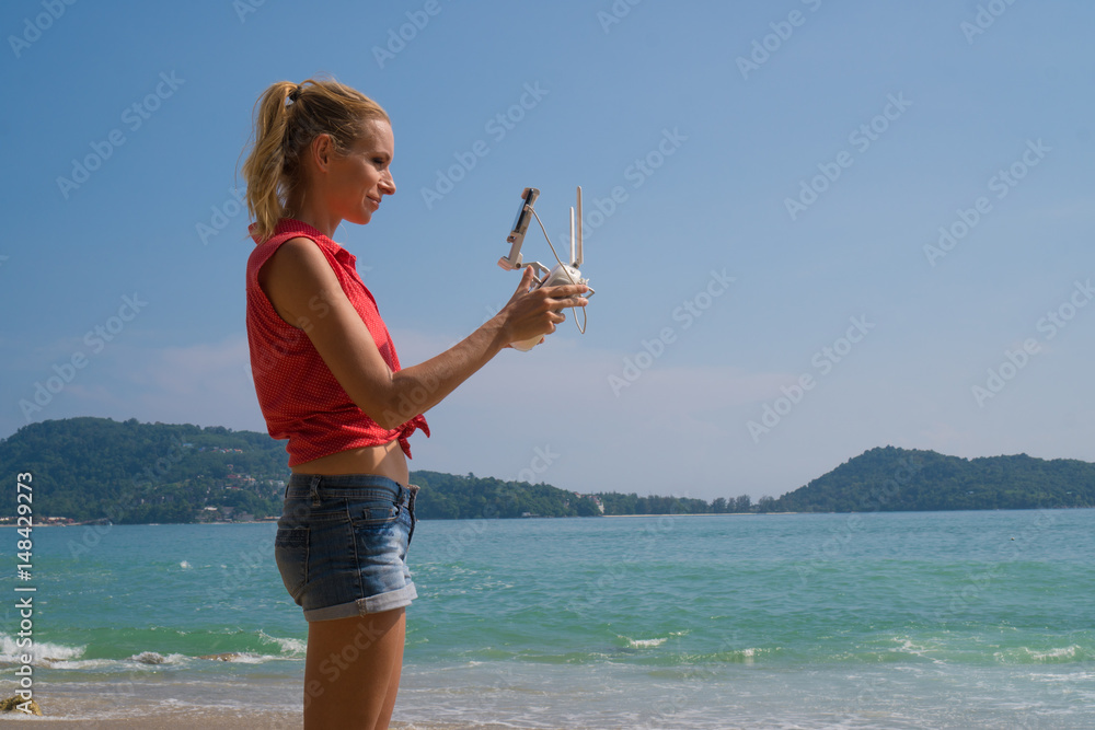 Happy woman standing on the beach with remote controller of drone over sea and sky background