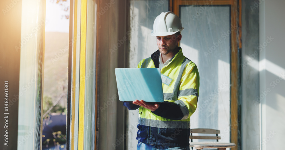 Man, laptop and contractor for inspection of construction, industrial planning and building renovation of development. Engineer, architect and project management with maintenance for infrastructure