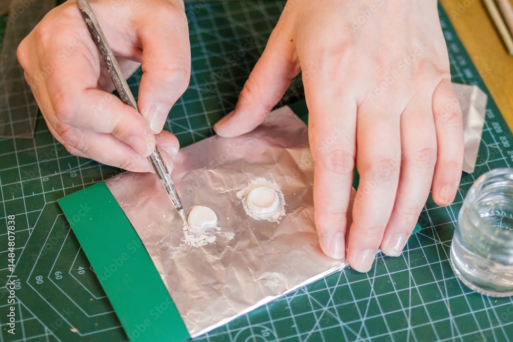 Close-up of hands working with silver clay with a fine brush, showcasing precision and detail.