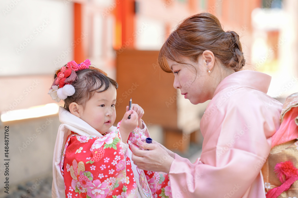 A 3-year-old Japanese girl in a red kimono celebrates Shichi-Go-San. Her mom, in a pink kimono, does her makeup. This photo shows a tender moment between mother and daughter on this special day.