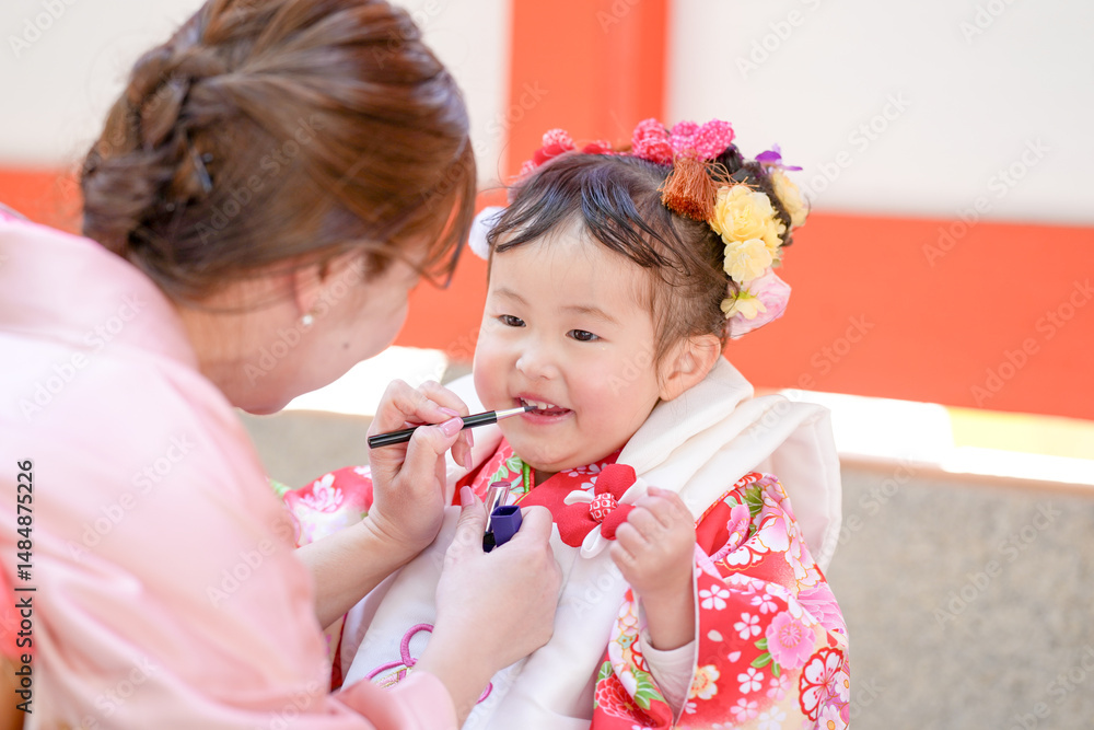 A 3-year-old Japanese girl in a red kimono celebrates Shichi-Go-San. Her mom, in a pink kimono, does her makeup. This photo shows a tender moment between mother and daughter on this special day.