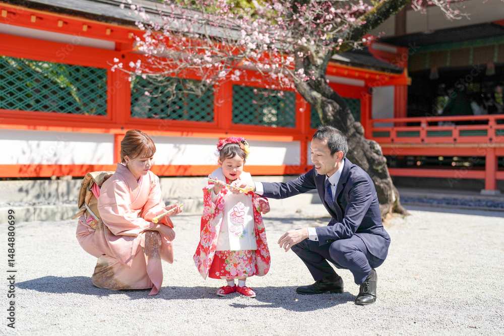 A 3-year-old Japanese girl in a red kimono plays under cherry blossoms at a shrine with her parents-mom in a pink kimono, dad in a suit-during Shichi-Go-San. This photo shows a joyful family moment.
