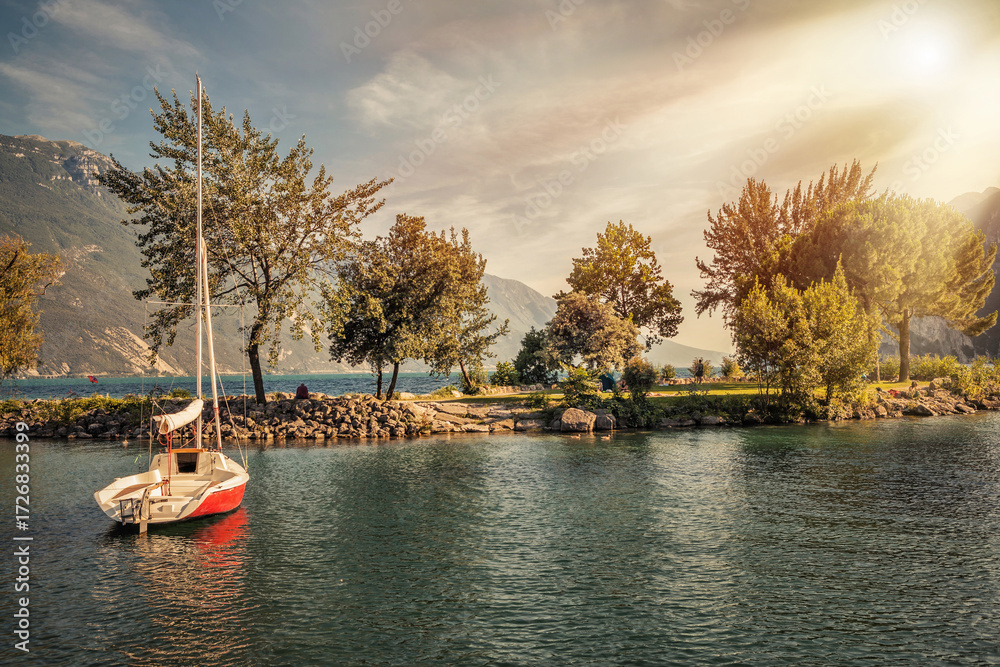 A 3-year-old Japanese girl in a red kimono plays under cherry blossoms at a shrine with her parents-mom in a pink kimono, dad in a suit-during Shichi-Go-San. This photo shows a joyful family moment.