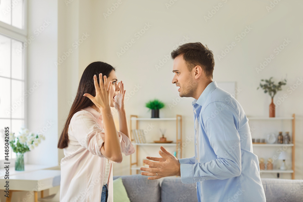 Young angry couple man and woman standing at home and arguing in quarrel. Unhappy husband and wife quarreling in the living room. Marriage problems, relationship and divorce concept.