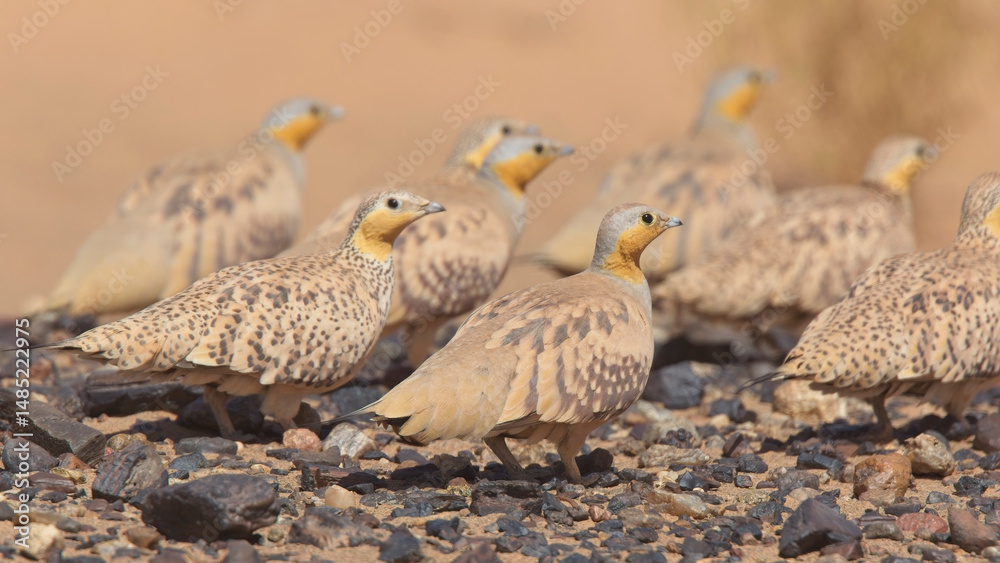 Spotted Sandgrouse (Pterocles senegallus) a group of males and females together in the stony desert region of southern Morocco.