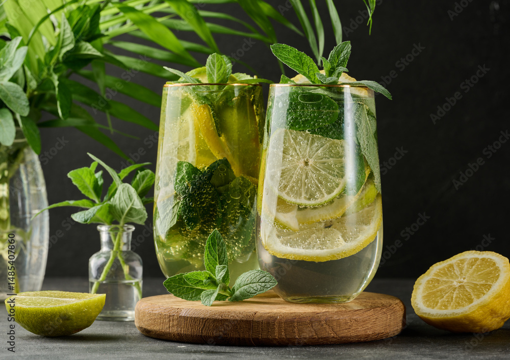 Refreshing detox or summer drink in a glass with lemon, lime, mint, ice, and metal straw. Dark background