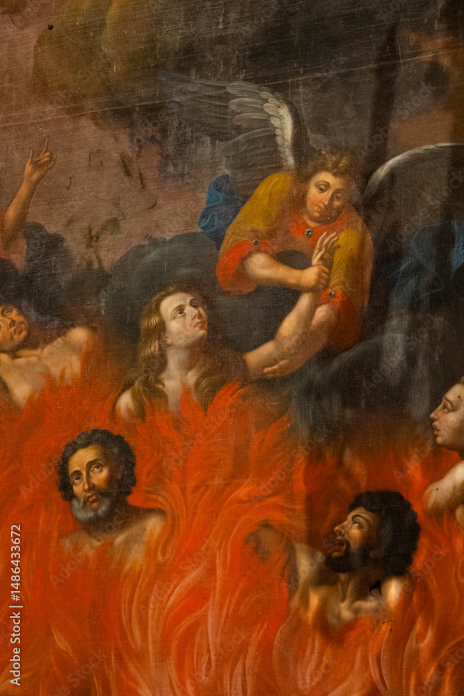 Painting (19th century) of Souls in purgatory fire waiting for the salvation of their souls.