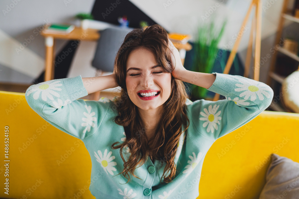 Charming smiling brunette woman relaxing on a sofa in a cozy apartment interior wearing a stylish floral cardigan during spring