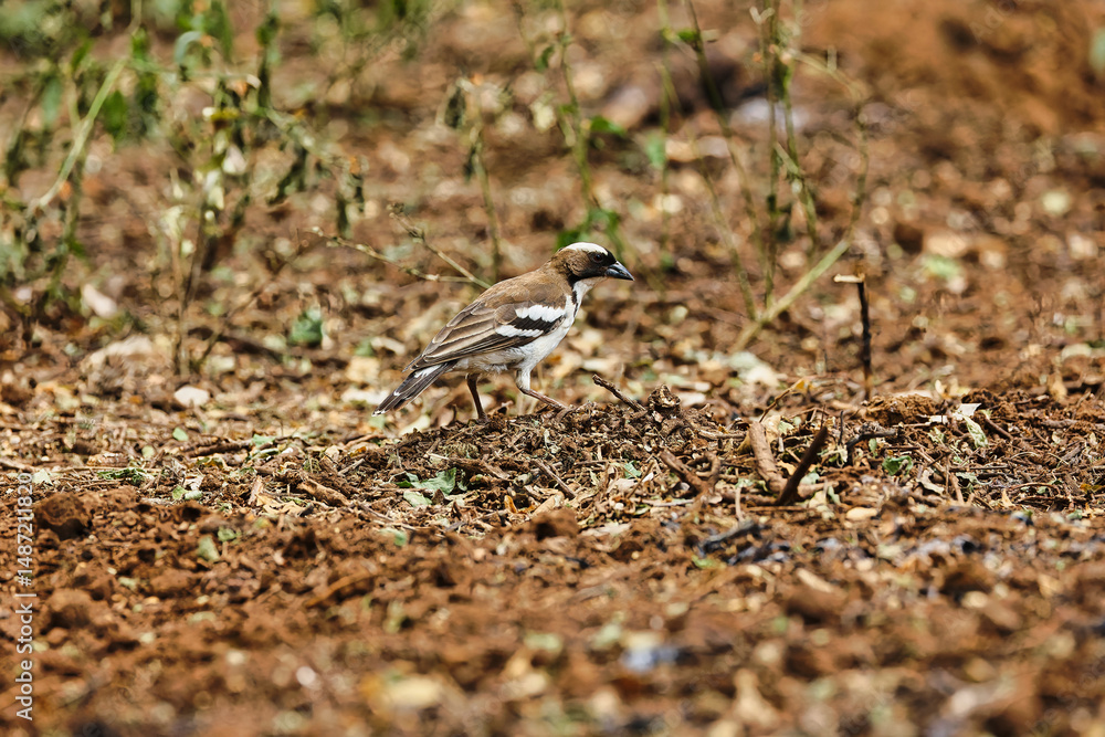 White-browed sparrow weaver sitting on the perch of a tree at amboseli national park, Kenya. Very beautiful to watch this bird right infront of our eyes.