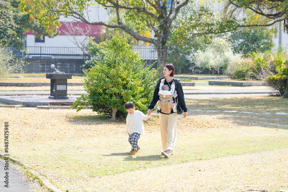 In spring at a park in Fukuoka, a mom in her thirties walks with her 3-year-old son and 6-month-old baby girl. They walk slowly together. This photo shows a calm and peaceful family moment outdoors.