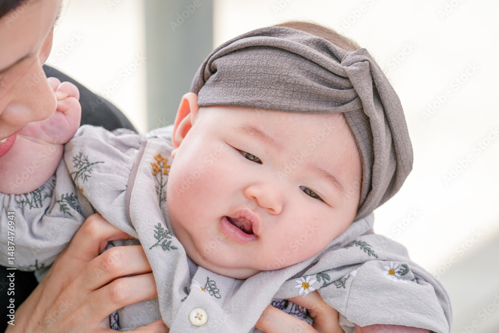 In spring at a park in Fukuoka, a mom in her thirties spends time with her 6-month-old baby girl. Held in her mom's arms, the baby looks calm. This photo captures a peaceful and loving family moment.
