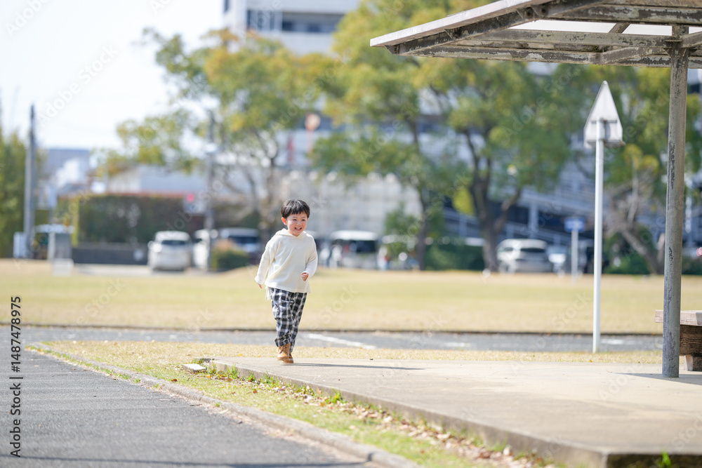 In spring at a park in Fukuoka, a 3-year-old boy runs with excitement through the open space. This photo captures his playful steps and the bright, cheerful spirit of a lively spring day outdoors.