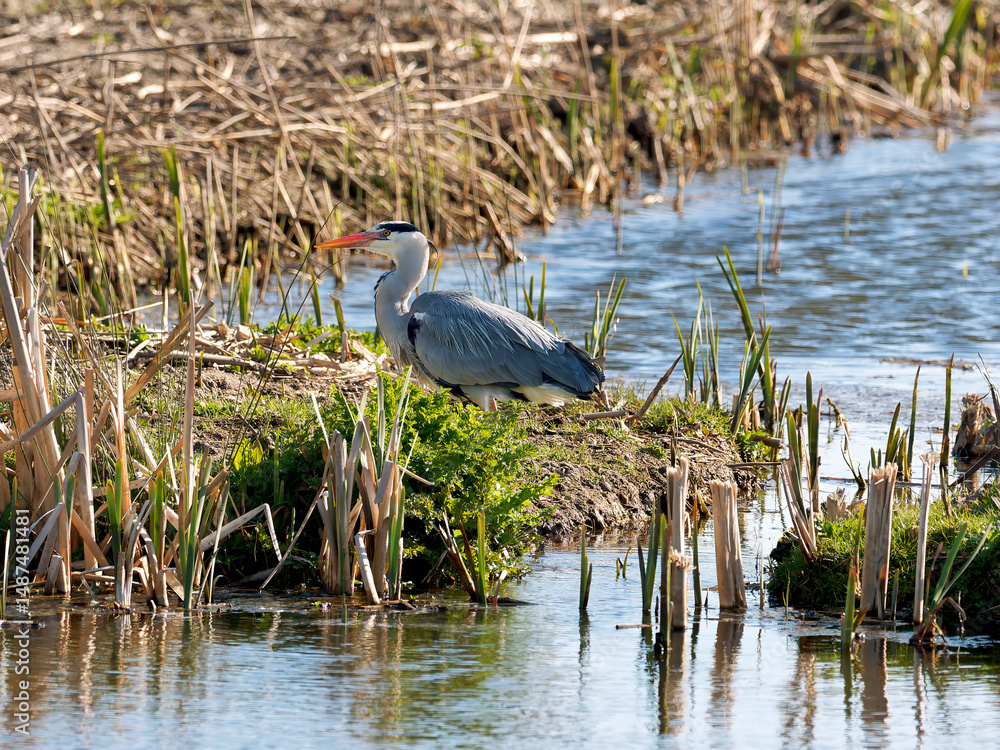 Grey heron amongst the reed beds at Seaton Wetlands in East Devon