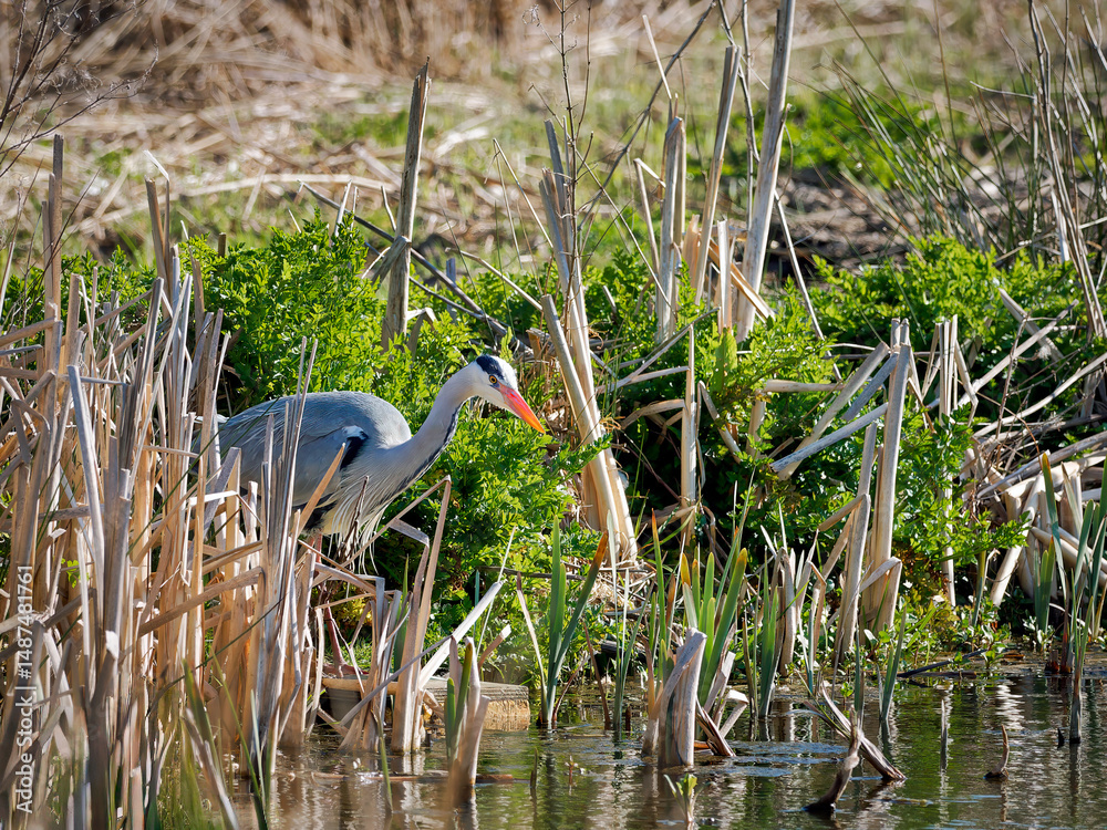 Grey heron amongst the reed beds at Seaton Wetlands in East Devon