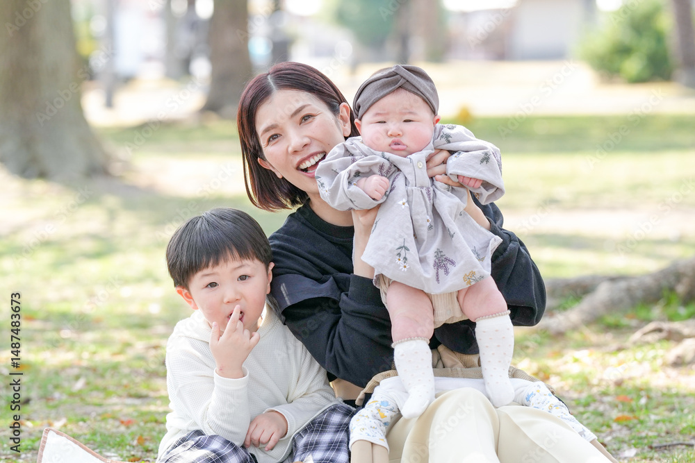 In spring at a park in Fukuoka, a mom in her thirties sits with her 3-year-old son and 6-month-old baby girl. They smile for the camera. This photo shows a calm and memorable family moment in nature.