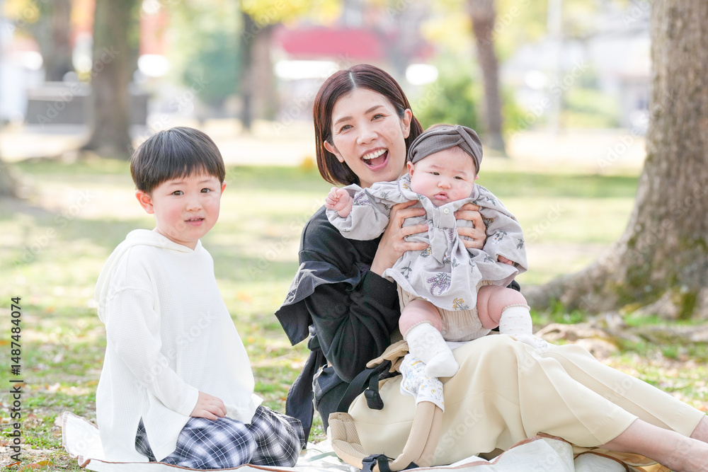 In spring at a park in Fukuoka, a mom in her thirties sits with her 3-year-old son and 6-month-old baby girl. They smile for the camera. This photo shows a calm and memorable family moment in nature.