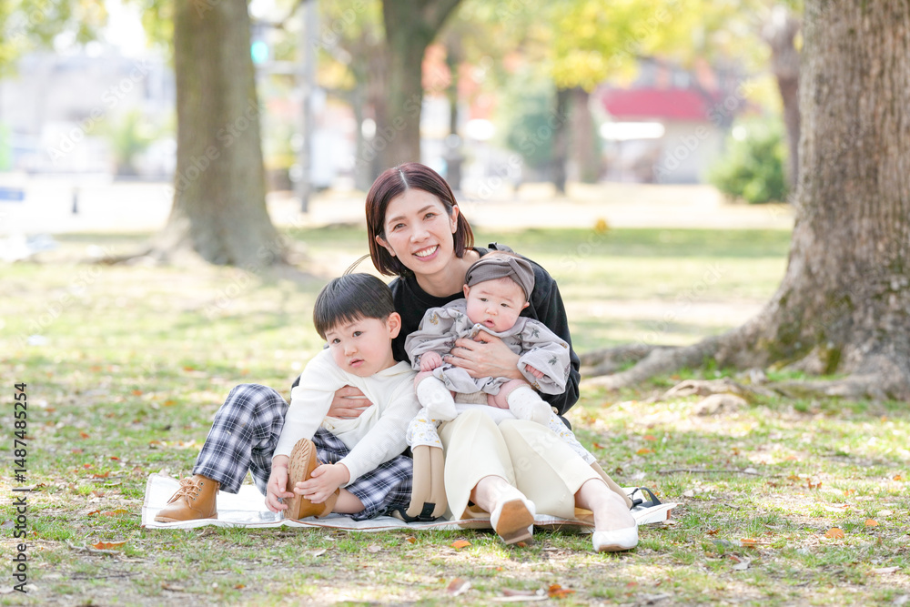 In spring at a park in Fukuoka, a mom in her thirties sits with her 3-year-old son and 6-month-old baby girl. They smile for the camera. This photo shows a calm and memorable family moment in nature.