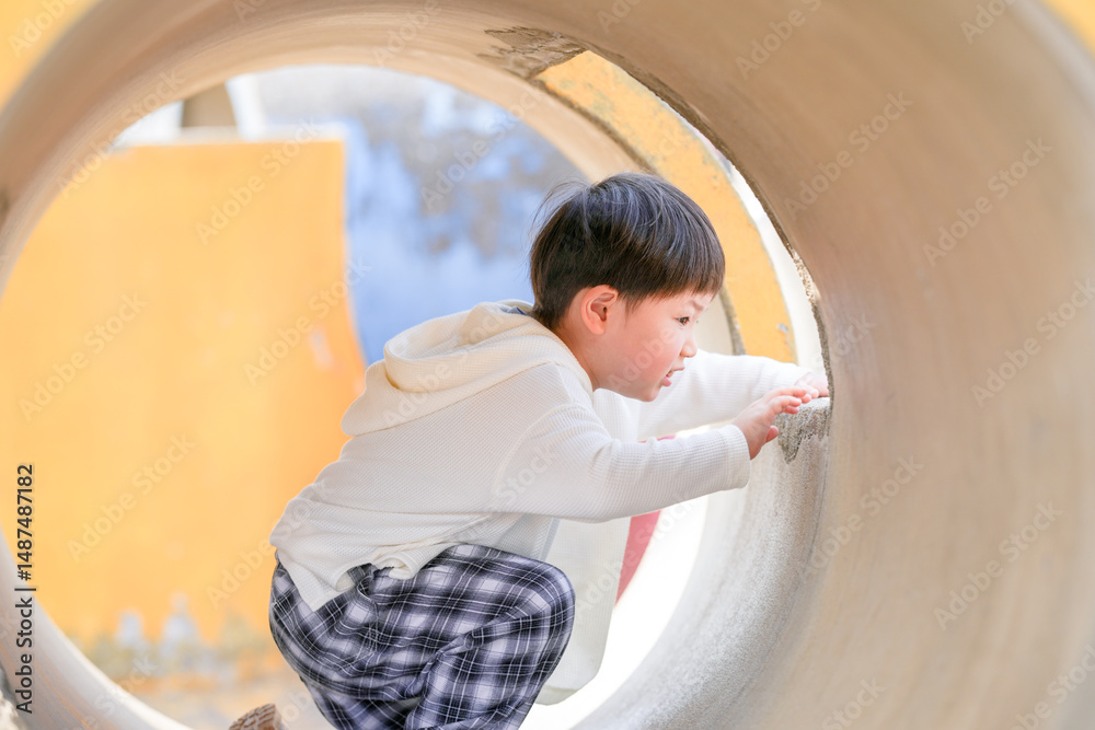 In spring at a park in Fukuoka, a 3-year-old boy plays on a concrete pipe playground structure. This photo captures his joyful spirit as he explores the playground equipment on a cheerful spring day.