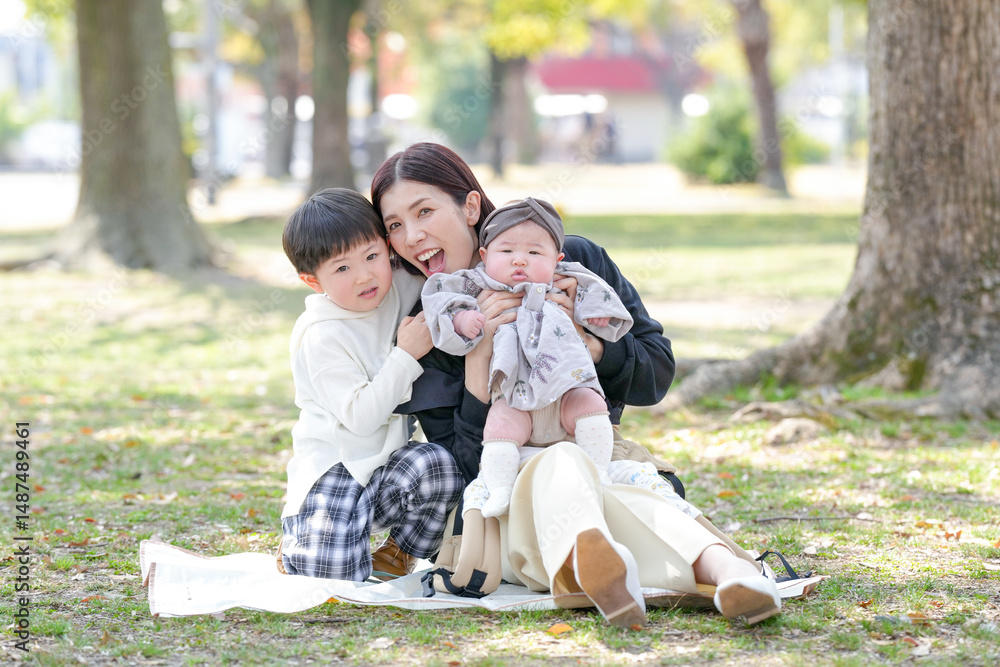 In spring at a park in Fukuoka, a mom in her thirties sits with her 3-year-old son and 6-month-old baby girl. They smile for the camera. This photo shows a calm and memorable family moment in nature.