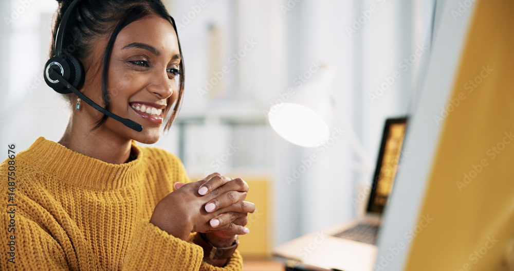 Call center, representative and woman with headset, smile and review of sales on computer or online. Customer service, agent and person with tech for communication, happy or employee with info on web
