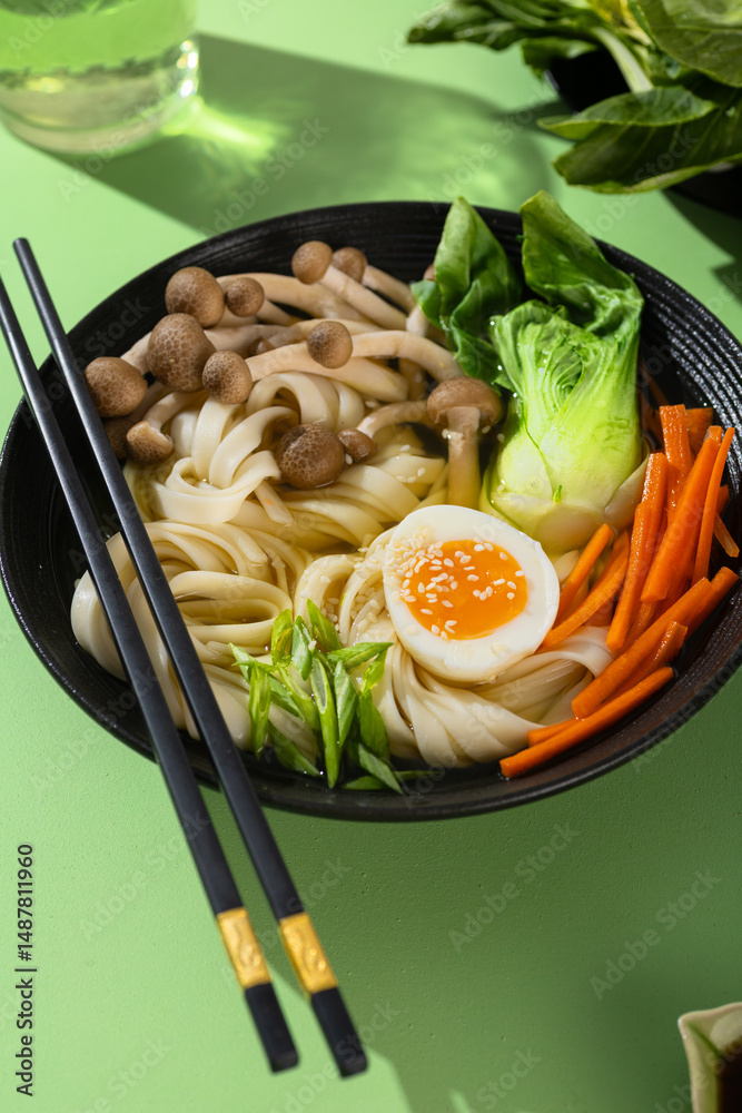Miso Ramen Asian noodles soup with mushrooms, egg and pak choi cabbage on green background, side view.