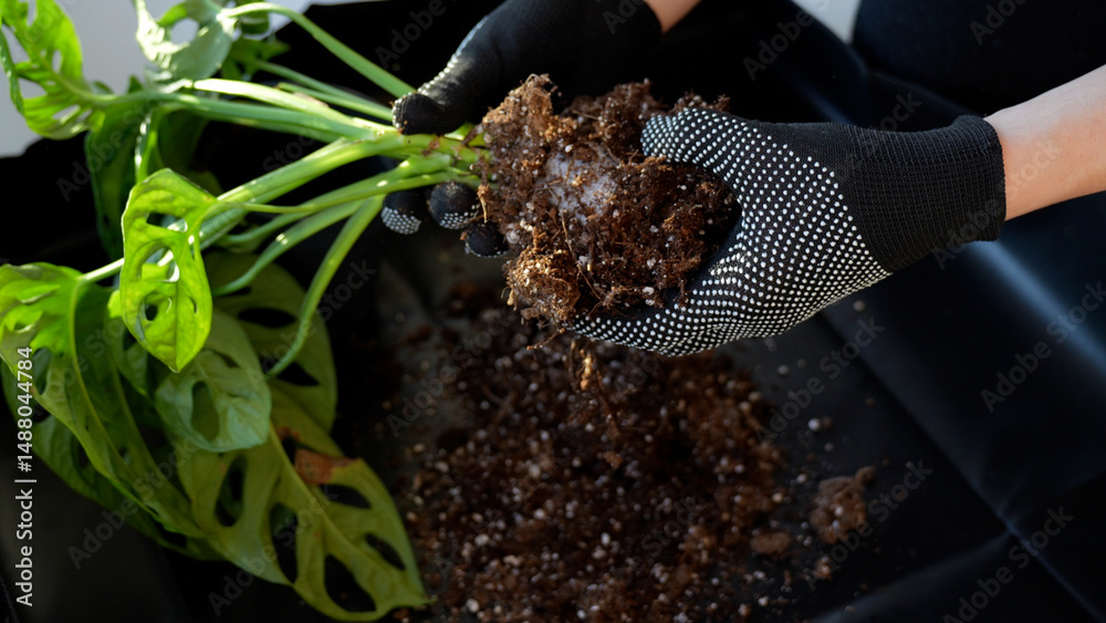 Gardener uncovering roots of monstera monkey mask on a sunny day