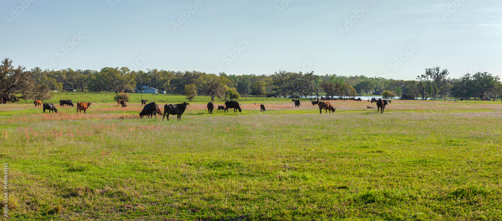 Panorama of a pasture with cattle on a bright spring day in central Florida