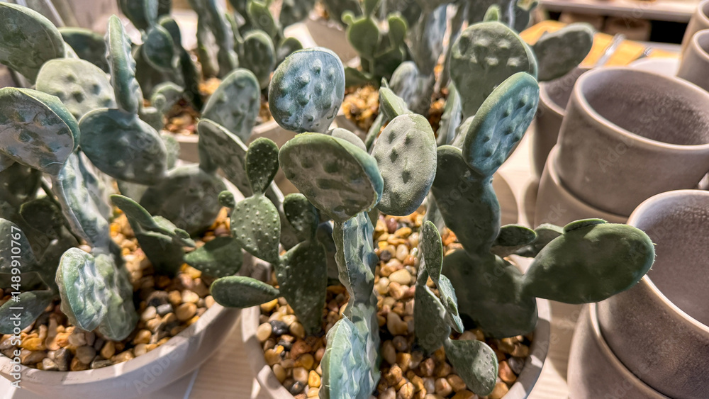 Prickly pear cacti sprout in zen-like ceramic pots, echoing Desert Plant Day's arid charm and resilient symbolism
