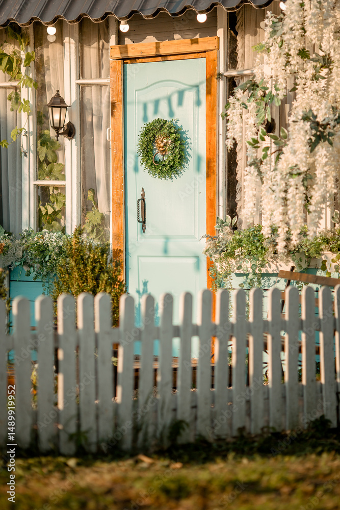 Wooden door with wreath in old house in country with white wooden fence and garden of white flowers