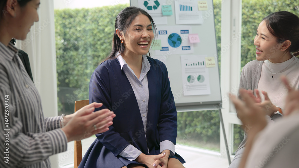 Carbon offset price report CO2 emission. Future growth Net zero waste in ESG ethical SME office protect climate change global warming social issues project. Group of asia people Eco friendly SDGs plan