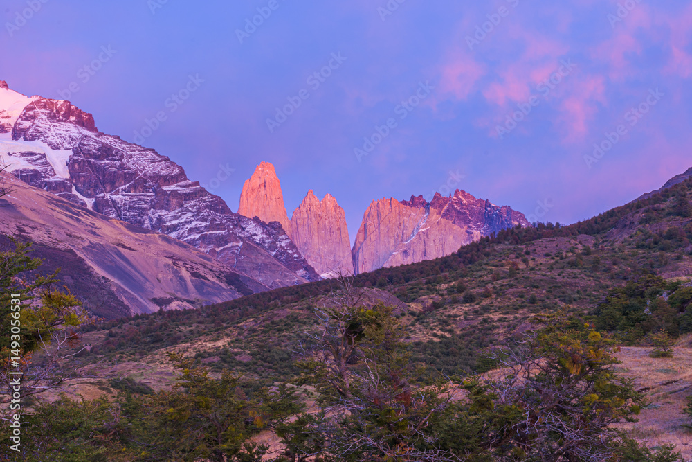 Wide view of Torres del Paine mountain range at sunrise in Patagonia, Chile. Pink skies and snowy summits create a dreamlike landscape.