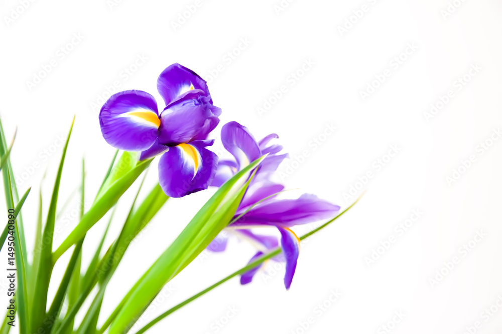 Beautiful violet iris flowers on a white background. Minimalist floral composition.