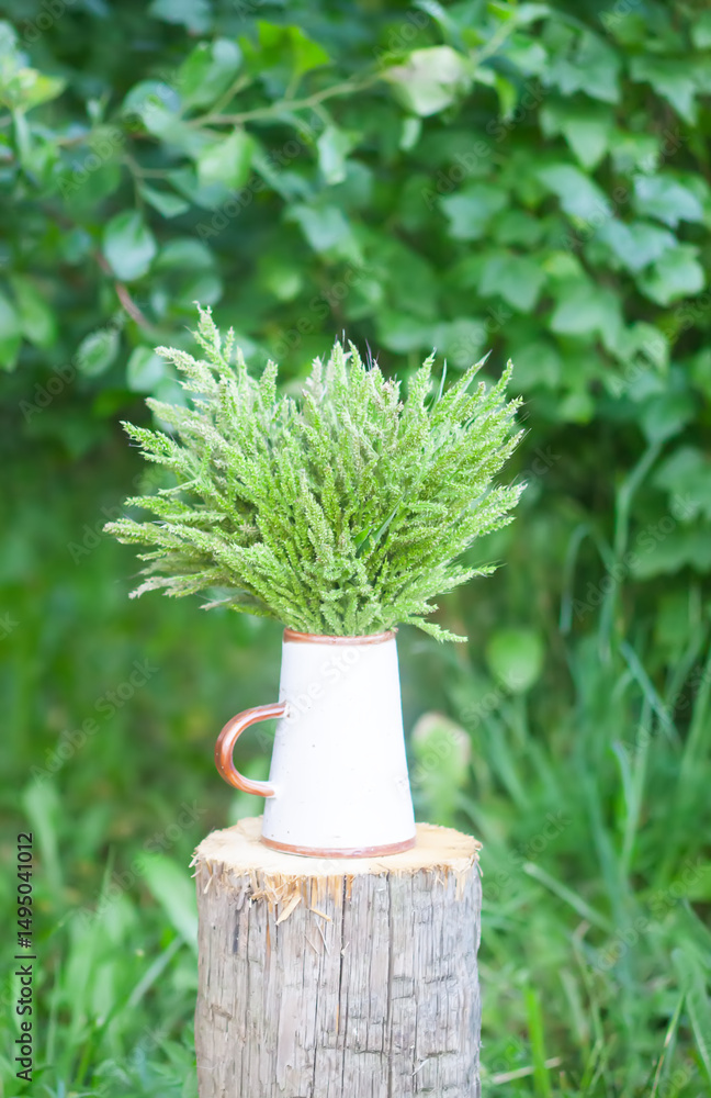 Bouquet of wild plants in ceramic mug outdoors.