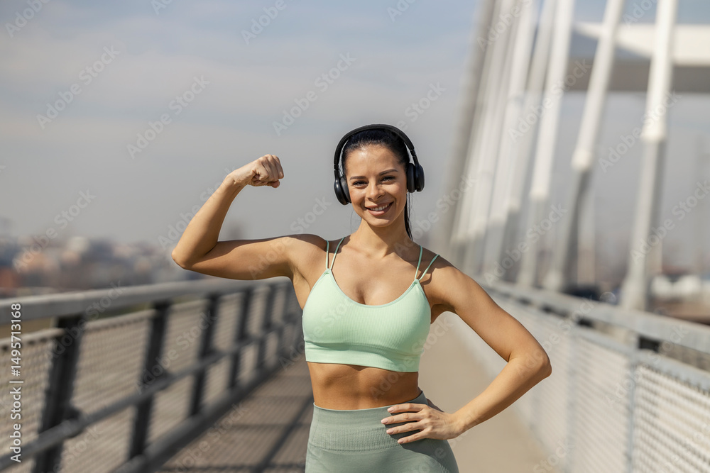 Portrait of female strong city athlete standing on a bridge and flexing muscles while smiling at the camera.