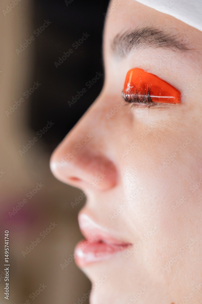 Caucasian woman undergoing eyelash lamination procedure.