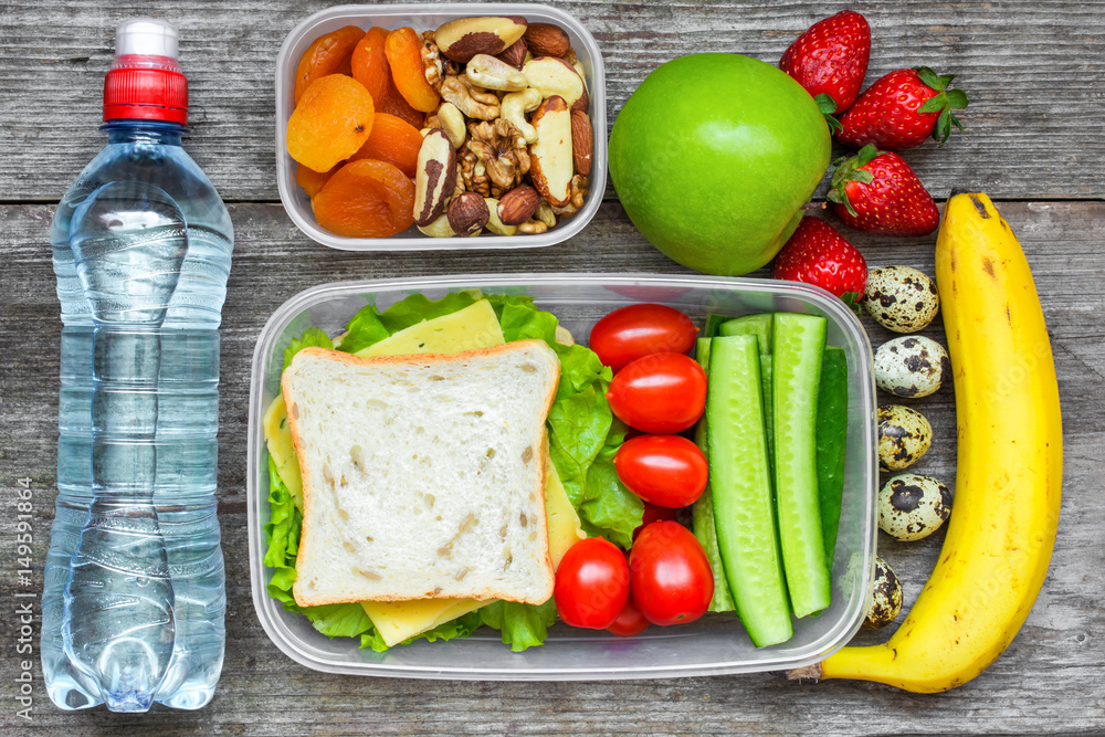 Healthy lunch boxes with sandwich, eggs and fresh vegetables, bottle of water, nuts and fruits