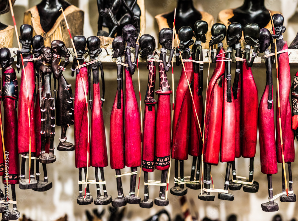 Masai, wooden african tribal figures at a market, Zanzibar