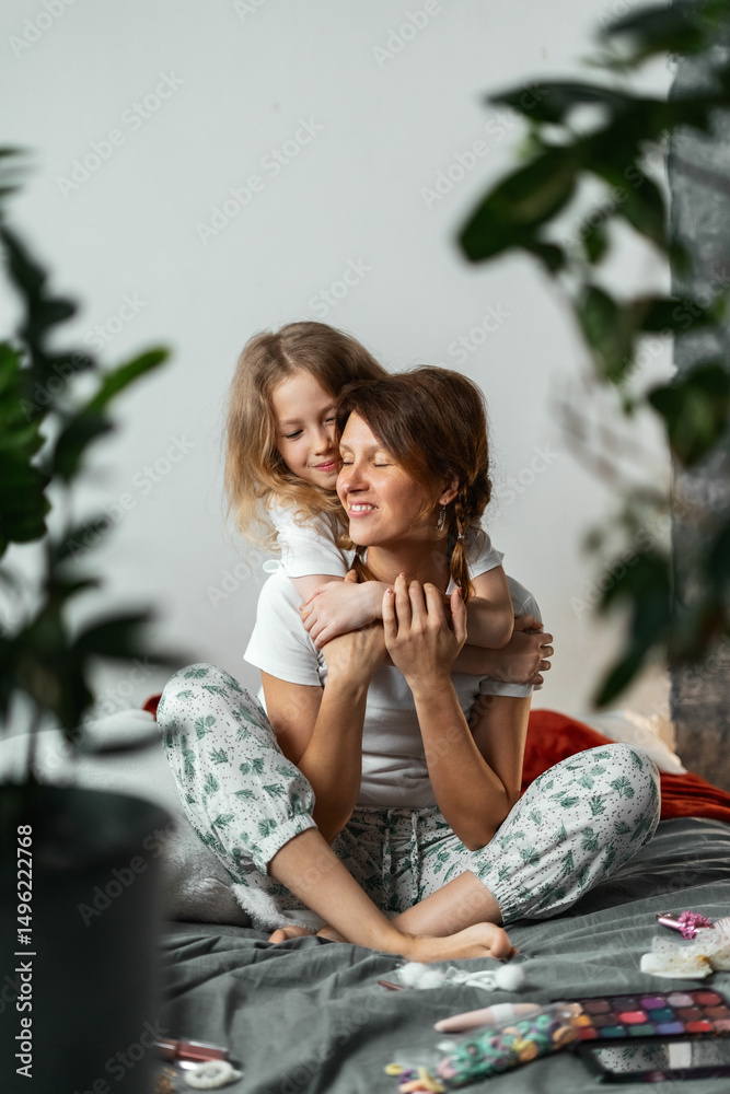 Happy mother and daughter spend joyful morning playing on sofa, smiling and laughing in cozy pajamas. Fun start of the day filled with love and positive energy. Concept mothers day.