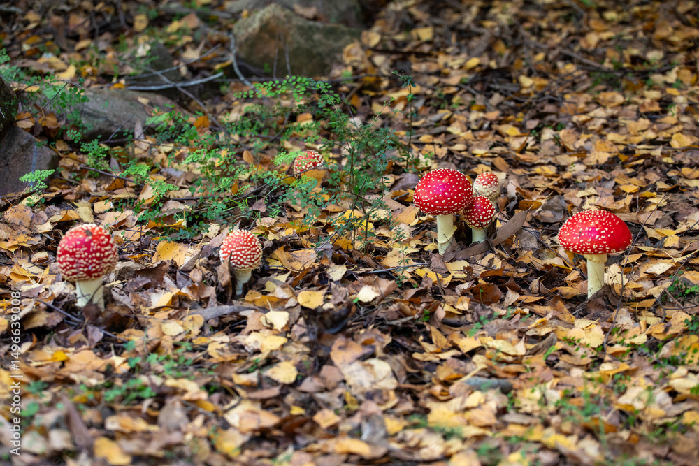 Fly agaric mushrooms amongst autumn leaves. Mid shot.