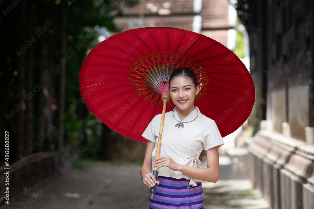 Cultural event young woman with a red umbrella traditional setting portrait photography outdoor environment vibrant colors