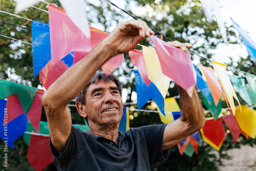 Elderly man preparing decorations for a traditional Festa Junina celebration