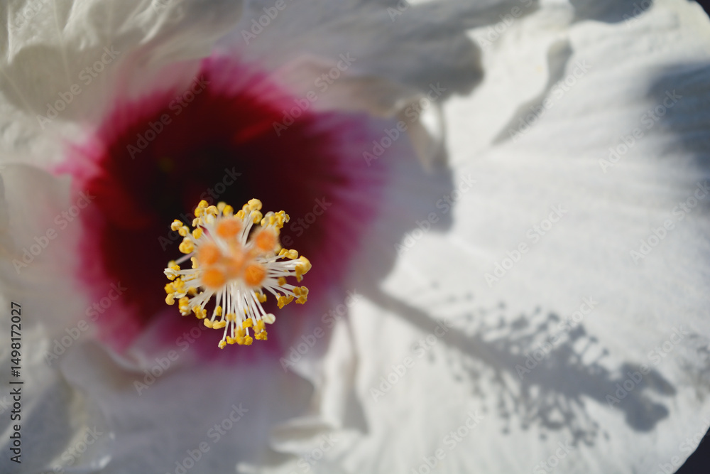 Textured white flower with magenta center and orange pistil (Hibiscus rosa-sinensis) Beautiful abstract detail in blooming flower.