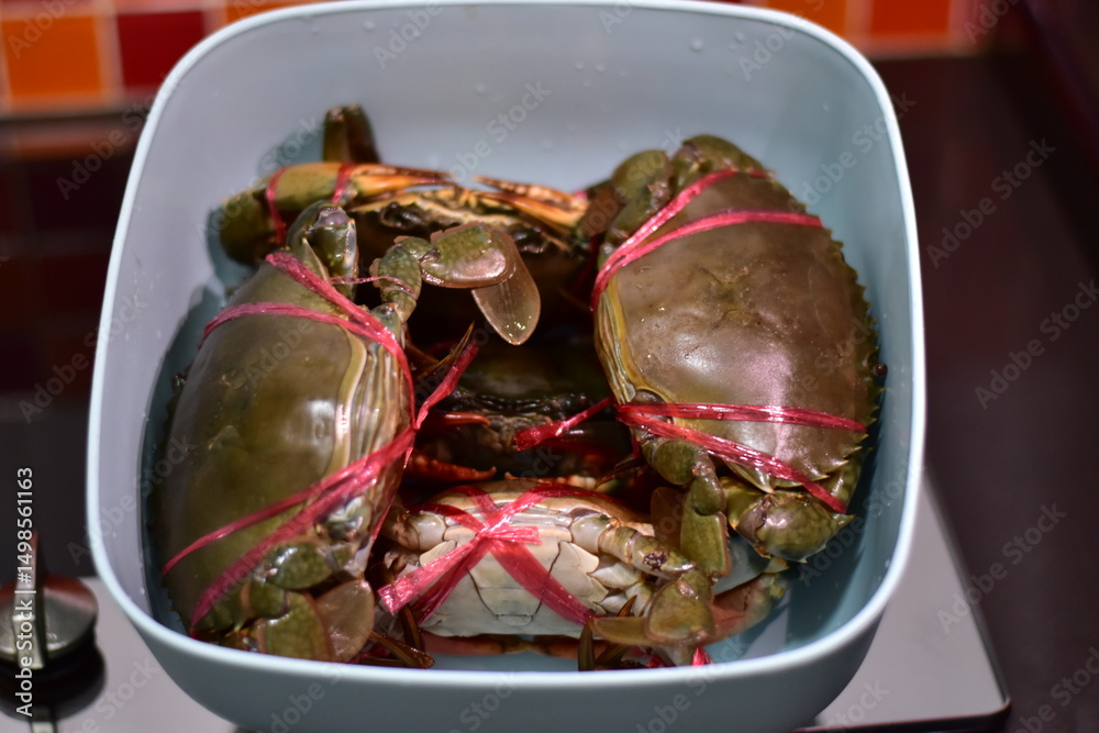 yellow curry with serrated mud crab, Fresh serrated mud crabs prepare to sell on street food market, Giant Mud Crabs, Serrated mud crab, Mangrove crab, Black crab,nighttime