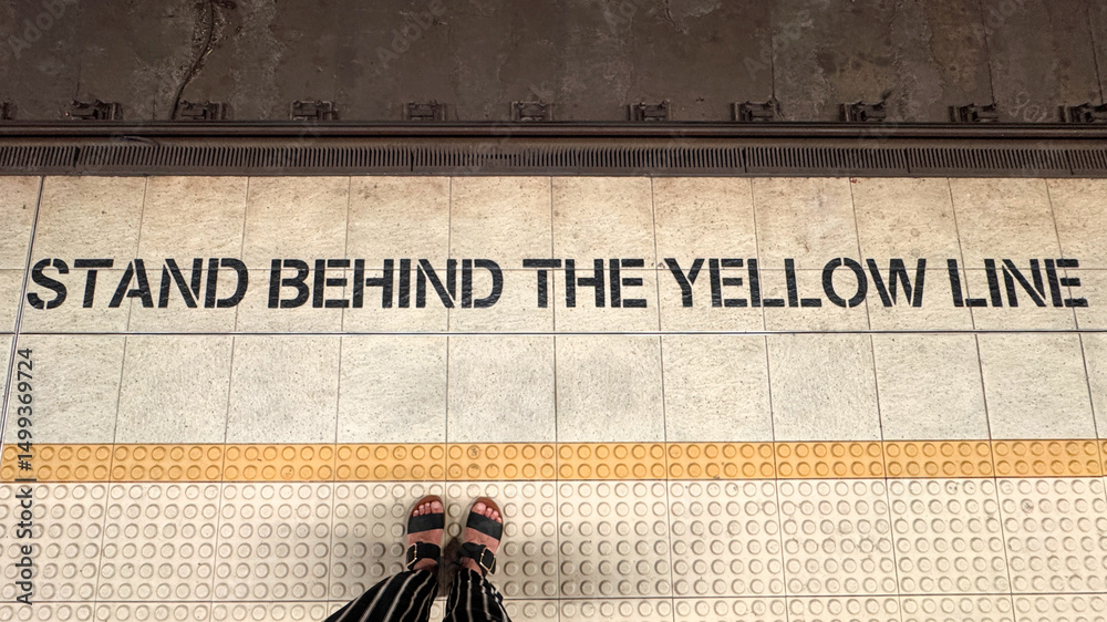 personal perspective looking down, woman standing on platform at train station with words, stand behind the yellow line