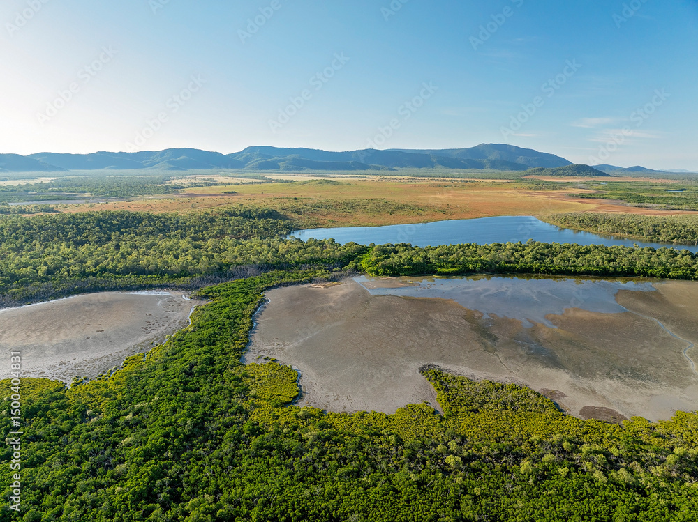 Aerial view of tidal forest with inland lagoon and grassy Queensland plains.
