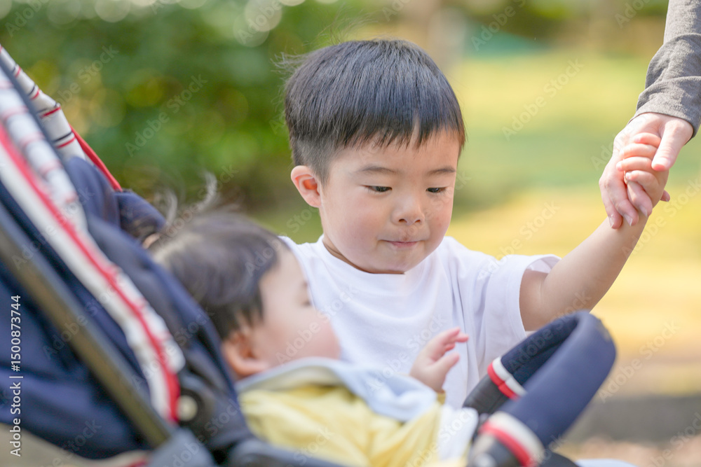 In March, at a sunny forested park in Japan, a 3-year-old Japanese boy gently touches his baby sibling in a stroller. This photo captures a tender sibling moment in a quiet spring setting.