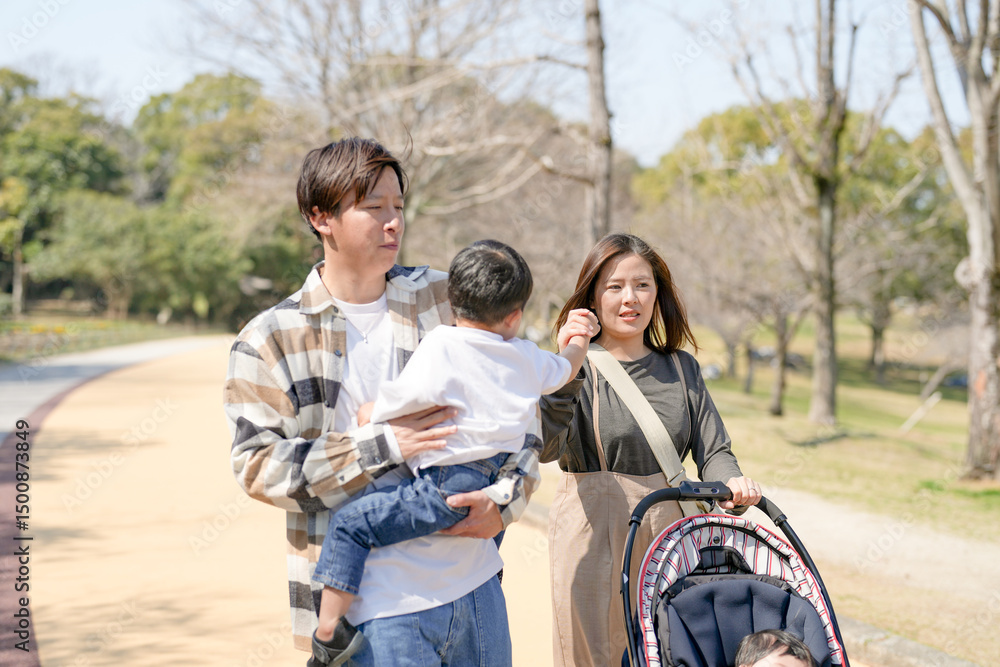In March, at a sunny forested park in Japan, a Japanese couple walks with their 3-year-old son and 6-month-old baby in a stroller. This photo captures a peaceful and loving family moment in spring.
