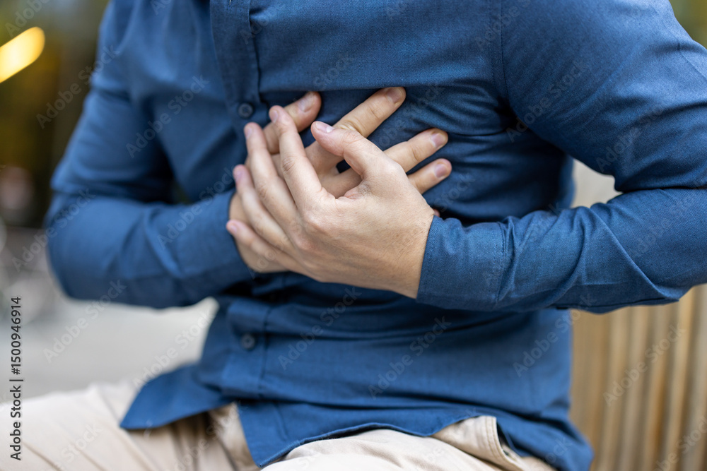 A man clutching his chest, a gesture of pain. Possibly experiencing a heart issue or discomfort, outdoors.