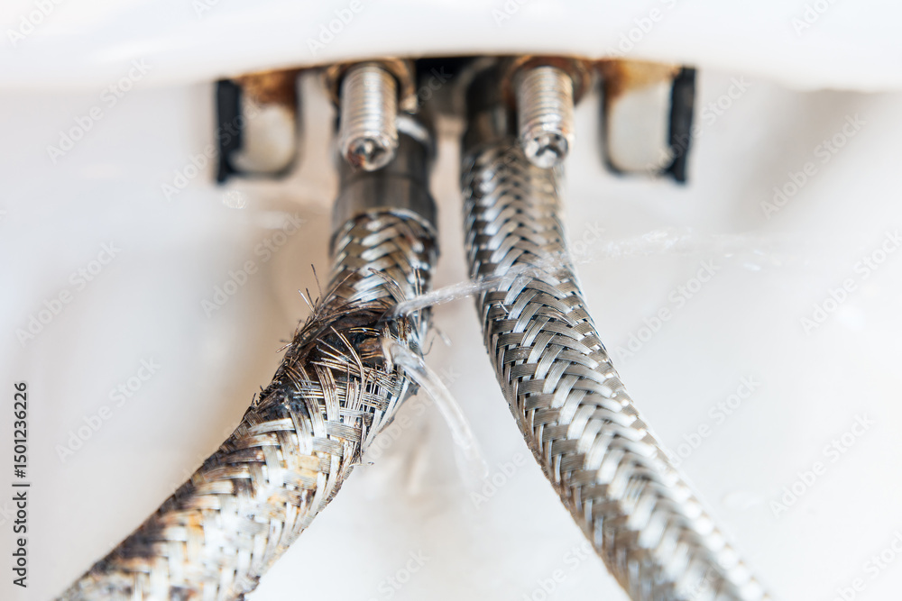The faucet connection hoses, one of which is burst and water is coming out of it under pressure.