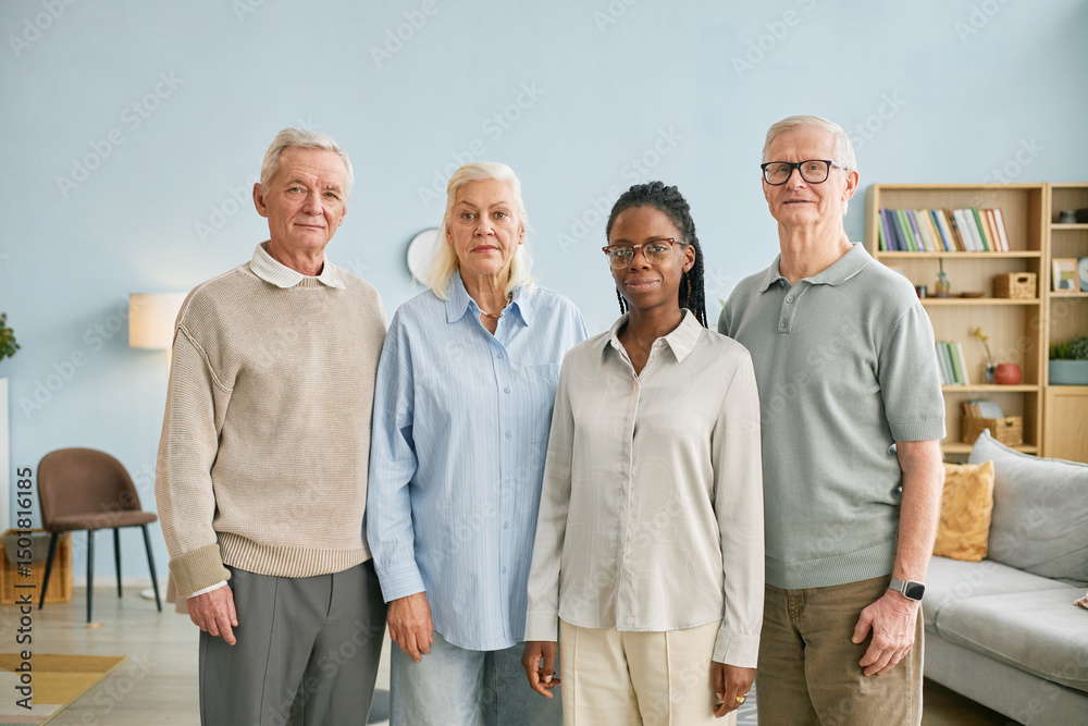 Portrait of diverse family with three seniors and one younger adult standing in modern living room. All members smile softly, exuding warmth and unity amidst homely surroundings